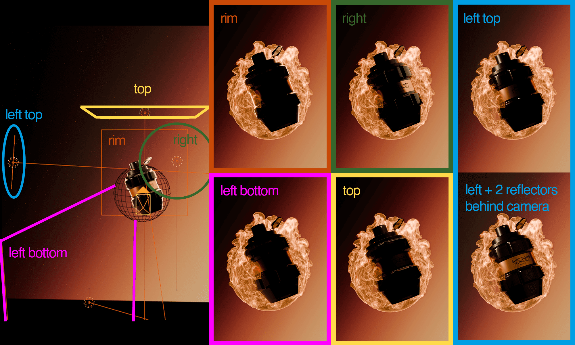 I found a grenade-shaped perfume bottle from Viktor and Rolf on Sketchfab, imported it into Blender, and began lighting the scene. It took quite a few light sources to bring out the highlights and properly define the shape.