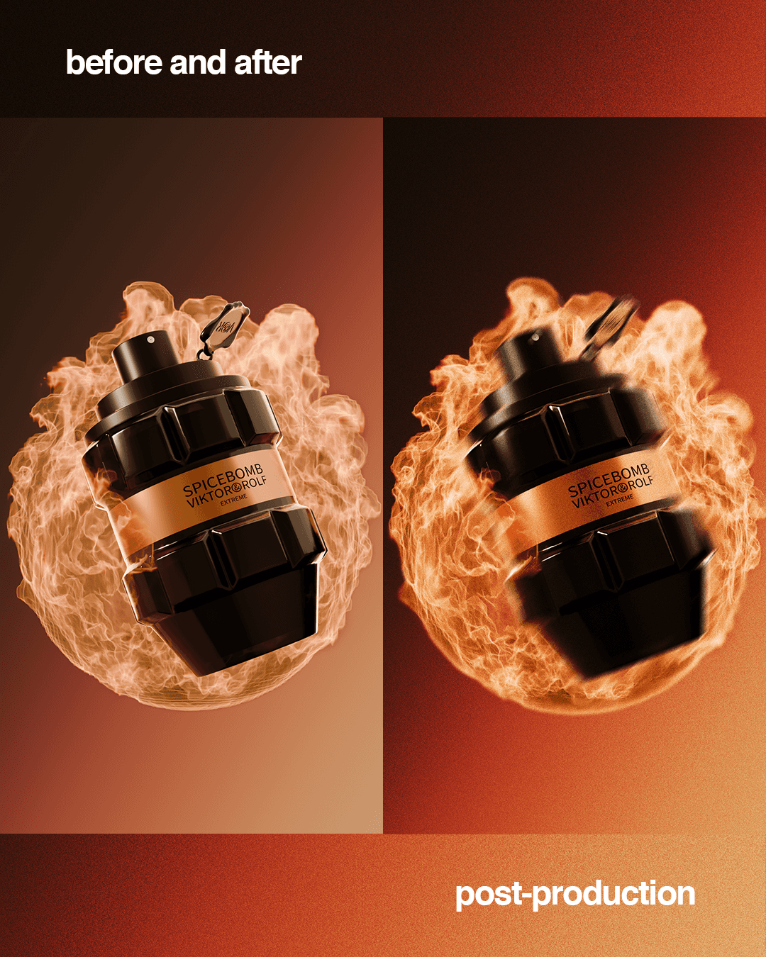 With a bit of polygon tweaking, I made the parfume bottle appear to fall into the flames, and added some extra movement to it with a motion blur mask in Photoshop. Some more work in Photoshop to touch up weaknesses in both the fire simulation and the 3D model - resulting in a final image that I’m really proud of.